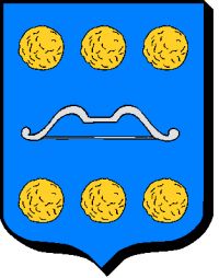 " D'azur à un arc d'argent posé en fasce et accompagné de 6 noix d'or rangées 3 en chef et 3 en pointe".