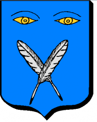 " D'azur à deux yeux d'or en chef et deux plumes d'argent passées en sautoir en pointe"